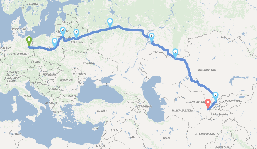 Die lange Anreise nach Zentralasien: Berlin, Warschau, Vilnius, Minsk, Moskau, Samara, Aqtobe, Taschkent, Samarkand. (Bildquelle: Graphhopper)